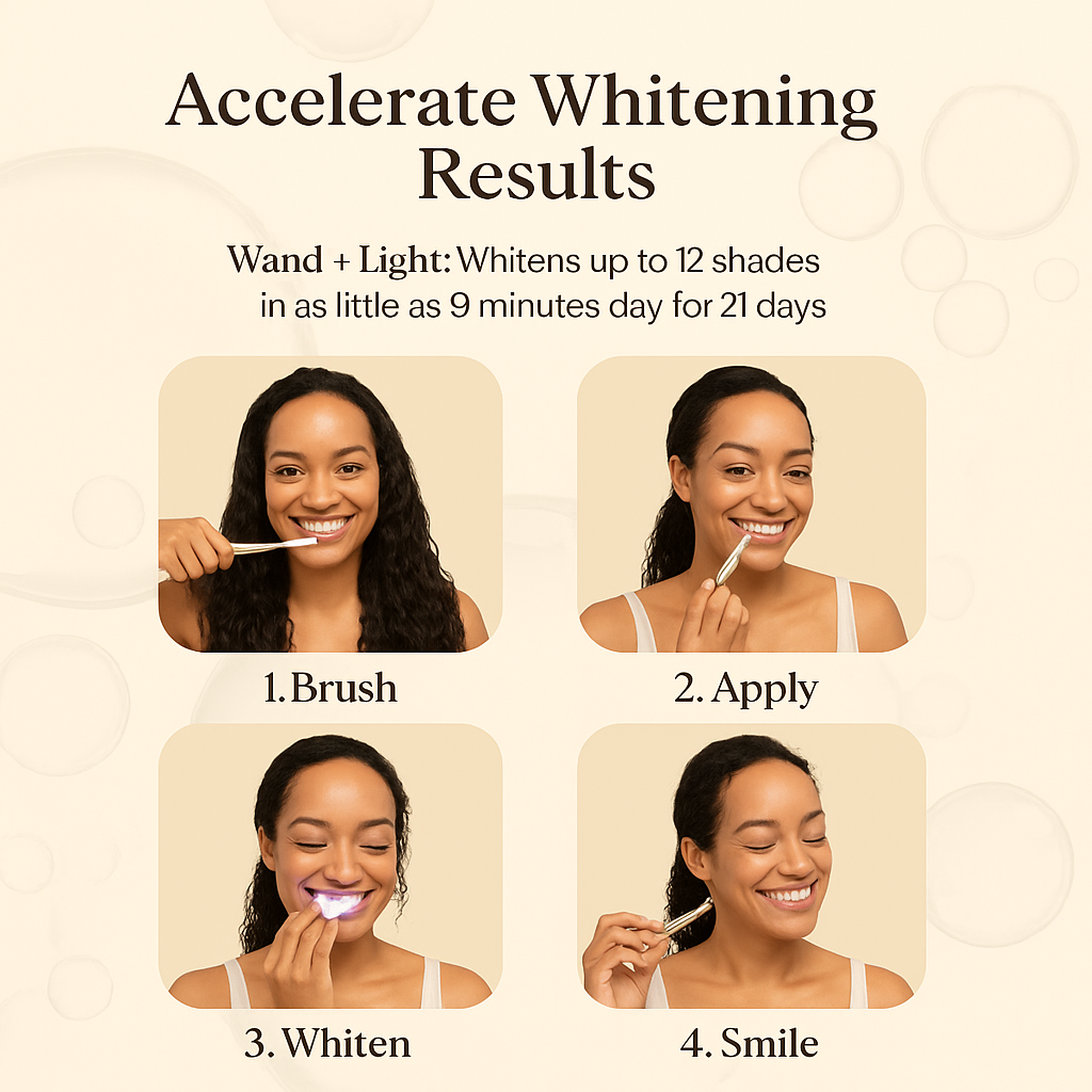 Twist the bottom of the pen until the gel appears on the brush tip. Smile and apply a thin layer to each tooth. Let it dry for 30 seconds—then you're good to go! Use 1–2 times daily for optimal results.